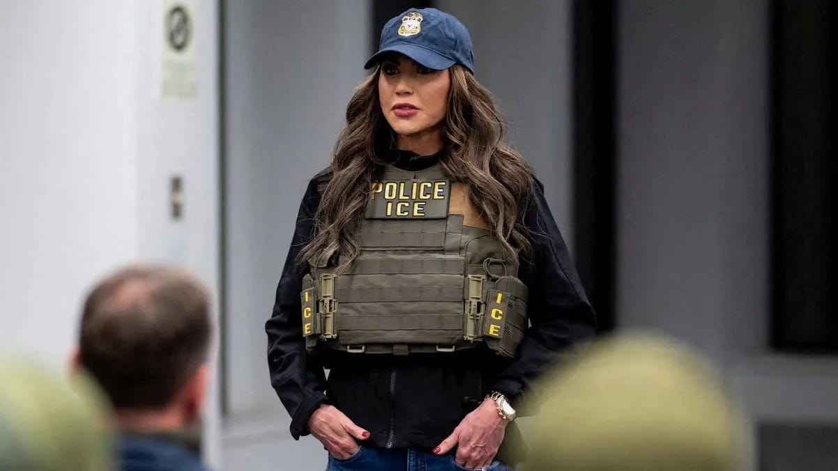 Noem loves to cosplay as a tough MAGA woman, with her cowboy hat, commando gear, and eight dump trucks worth of makeup.